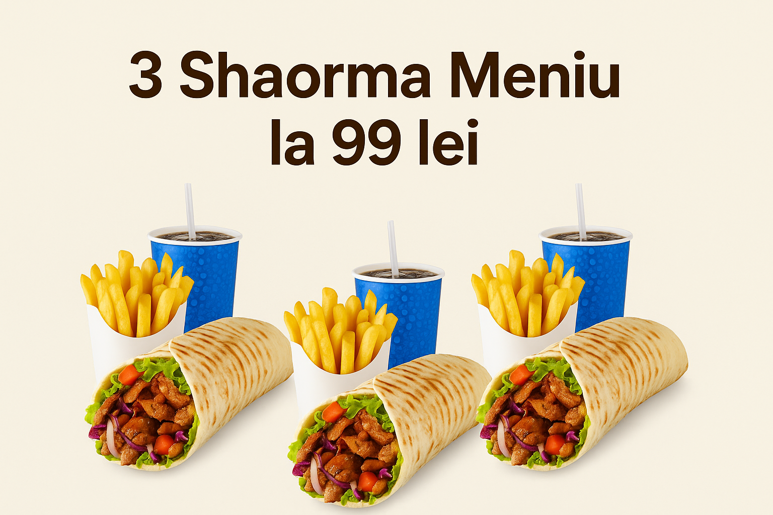 3 shaorma + 3 porții de cartofi + 3 sucuri