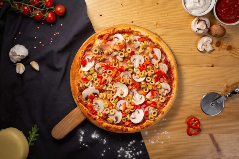 sos rosii, mozzarella, sunca, ciuperci, gogosar, masline