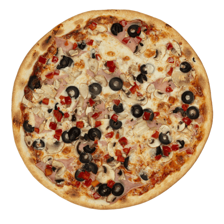 sos rosii, mozzarella, sunca, ciuperci, gogosar, masline