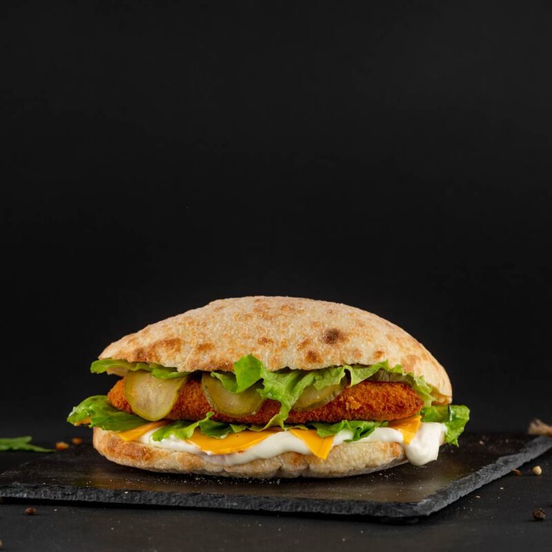 Snitel, cheddar, sos de usturoi, salata iceberg, castravete murat, rosii