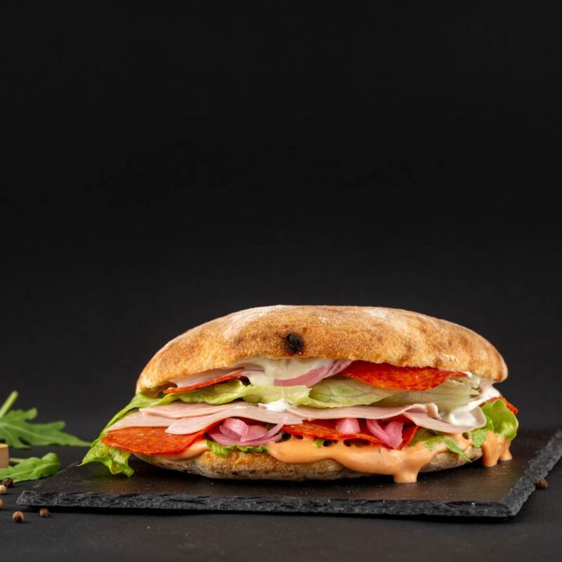 Sunca, mozzarella, salam, ceapa, rosii, salata iceberg, sos Tutti, sos usturoi