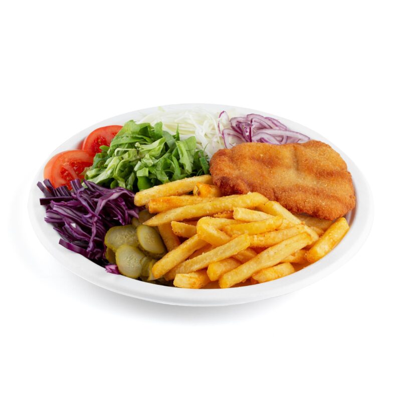 chifla, snitel, cartofi prajiti, varza rosie, salata iceberg, castraveti murati, rosii, ceapa, varza, sos tutti