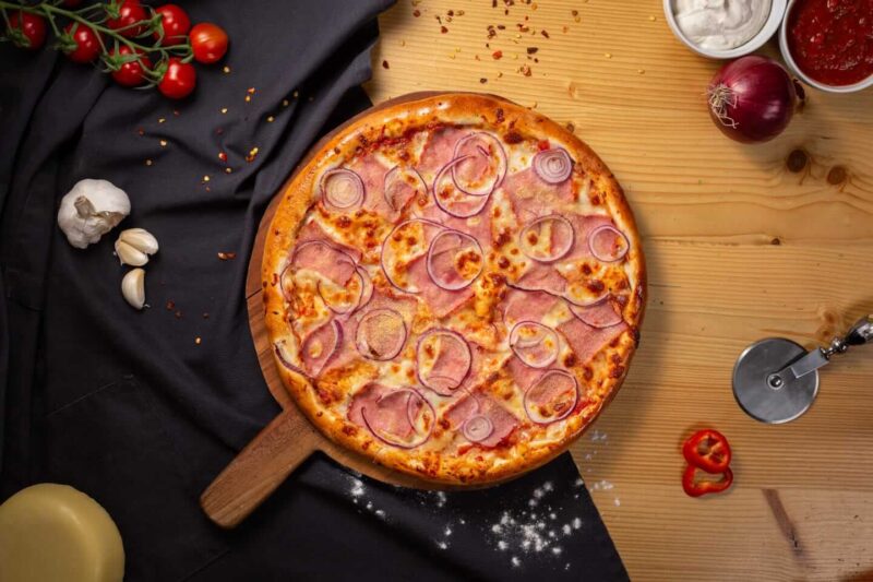 sos rosii, mozzarella, bacon, ceapa, usturoi